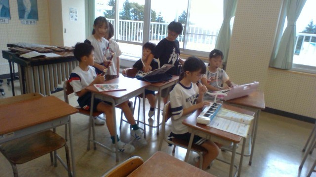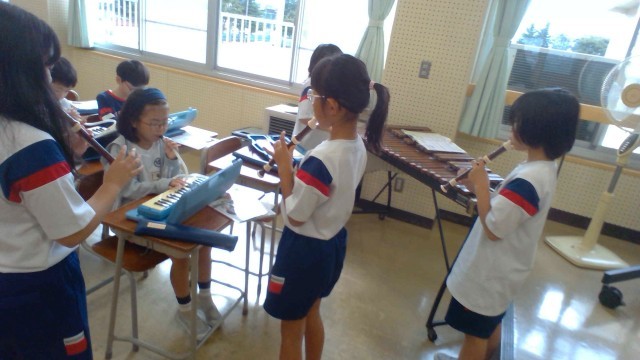 音楽科の学習で合奏に挑戦した3年生。鍵盤ハーモニカ、リコーダー、木琴の3つの楽器で4つのパートを演奏します。お互いの音を聴きながら、速さに注意して発表の練習に取り組みました。本番ではとってもすてきなハーモニーを聴かせてくれました。