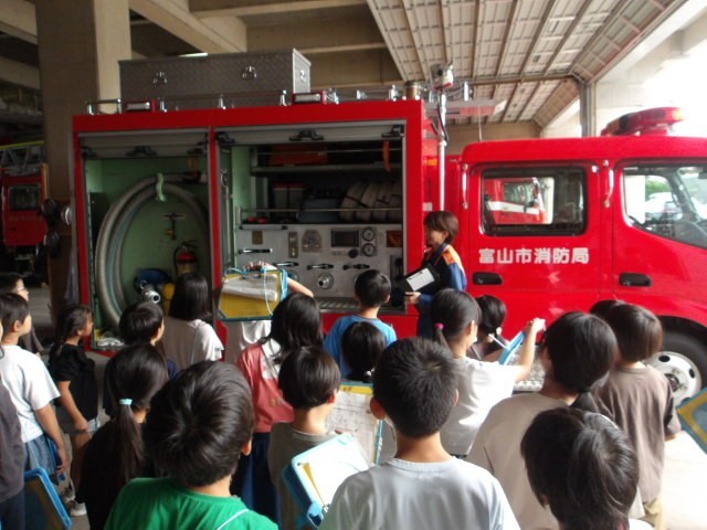 3年生校外学習の午後の活動は、富山県総合運動公園で昼食を食べ、富山市消防局 富山消防署に行きました。通信指令室や消防車を集中して見学しました。