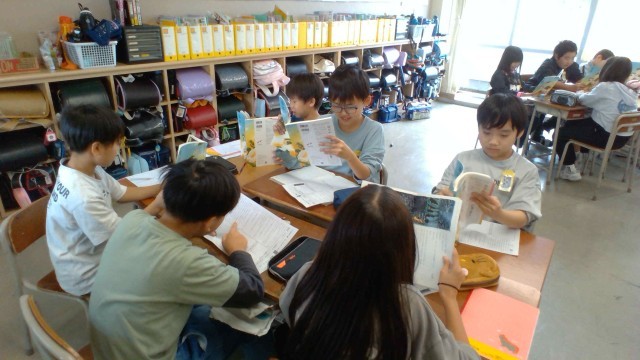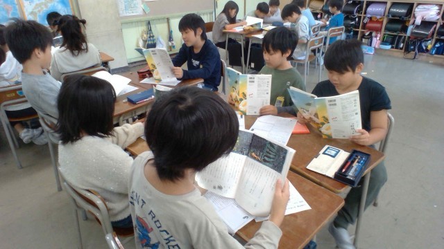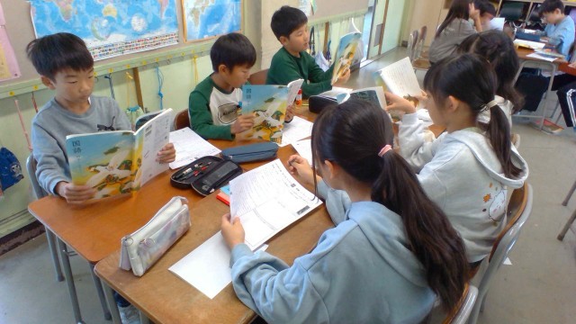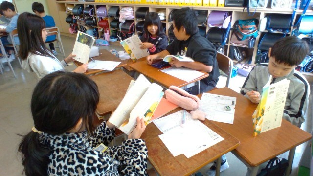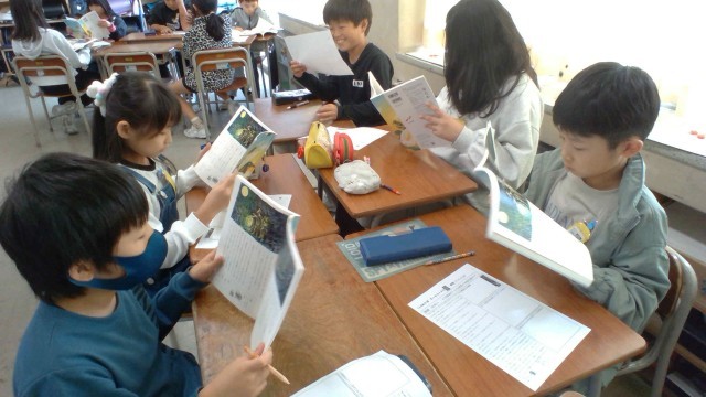国語科「ごんぎつね」の学習では、毎時間グループでの音読に取り組んでいます。しっかりと声に出して読んだ後、ごんや兵十等の気持ちについて話し合い、自分の考えをワークシートにまとめました。