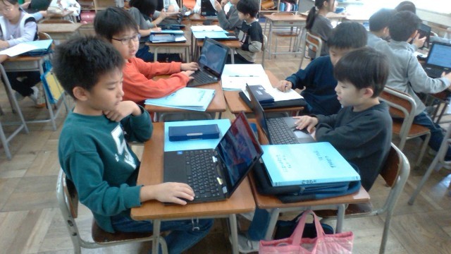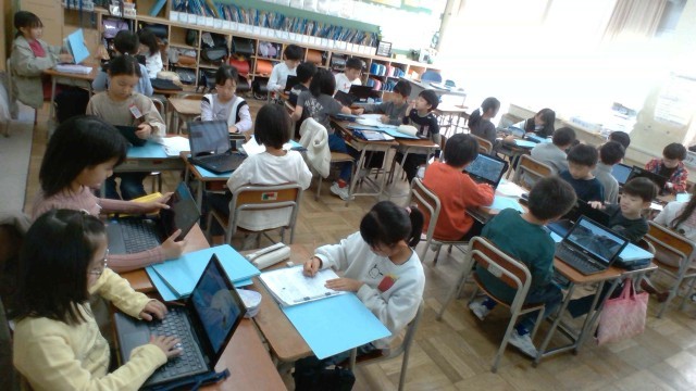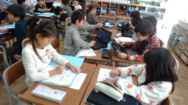 総合的な学習の時間「蜷川すてき探偵団」の学習では、今まで6つの団体を招き、活動について話を聞き、広めたい伝えたいと思う、「蜷川のすてき」な人々を決めました。今はグループに分かれ、情報交換したり、インターネットを使って調べたりしながら、伝えるための材料を集めています。