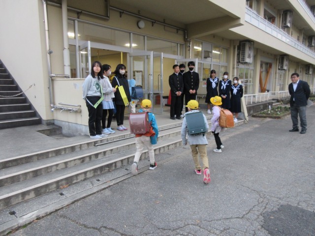 11月14日(金)に堀川中学校の1年生から3年生が蜷川小学校に来て一緒に挨拶運動を行いました。いつもは運営委員会の児童が挨拶運動をしていますが、今日はさらに元気な挨拶が飛び交っていました。