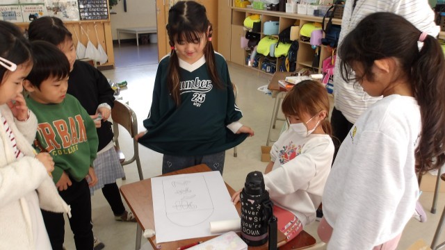 算数科「かたちあそび」の学習で、箱の形を紙に写し、電車やロボットや花を作って楽しみました。