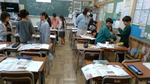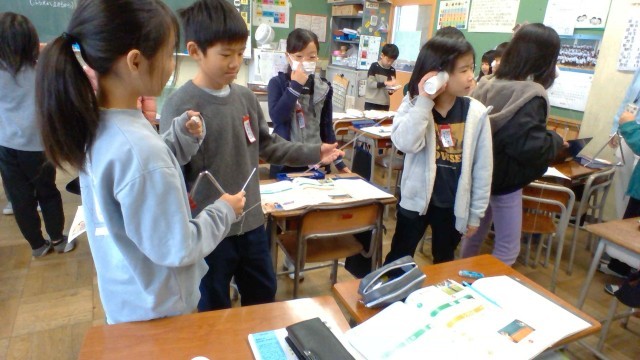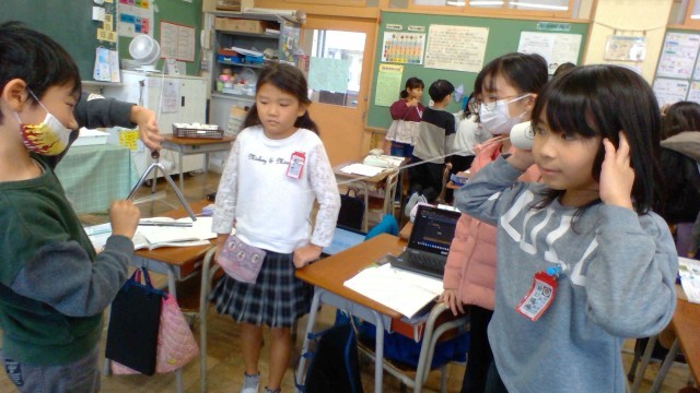 「音が出るとき、物はふるえているのかな。ふるえを止めると、音も止まるのかな」という疑問を解決するために、トライアングルと紙コップ登場!グループで音を鳴らす人、聴く人、糸をつかむ人、タイムを計る人と、役割に分かれて実験しました。