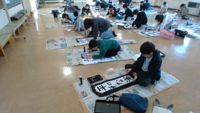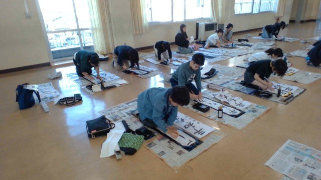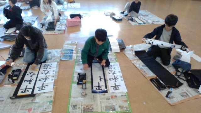 お手本をよく見ながら、書初め用紙に一画一画丁寧に練習をしています。