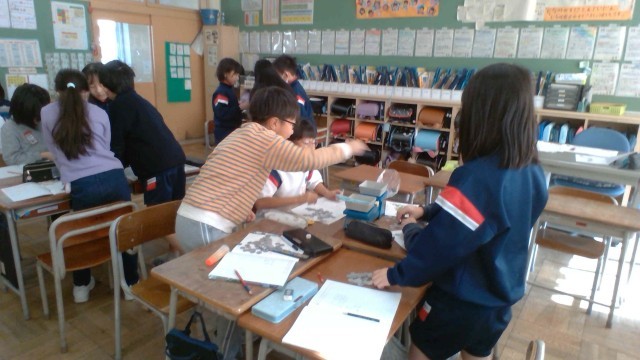 算数科の学習で重さを比べました。「てんびんがあるとどっちが重いかすぐに分かる」と分かったけれど、クラスのみんなと比べるのは大変!そこで、1年生の長さや、2年生のかさの学習と同じで、何か基になるものがあればいいのではないかと気付いた子供たち。比べたいものの重さを積み木何個分、1円玉何個分で表しました。すると「コンパスが重い班が多い」「〇班の消しゴムが重いけれど、どれくらいの大きさなのか気になる」「1円玉の方が家の人に重さを伝えやすい」と、クラスのみんなと比べることで、様々なことに気付きました。