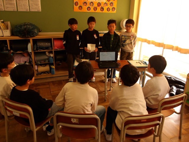 蜷川校区のすてきなところを大判紙やグーグルスライドを用いて、聞く人のために工夫して発表していました。