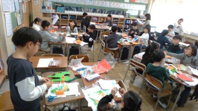 理科で磁石の性質を学習中の子供たち。図画工作科では、その磁石の性質を使ったおもちゃを制作しています。見本にあるレース場や魚釣りだけでなく、回るすし屋、迷路鬼ごっこ、クレーンゲーム等見本にはないものでも、想像を広げて作っています。「いいこと思いついた!〇〇にしよう」と、グループで楽しく活動中。出来上がってみんなで遊ぶのが楽しみです。