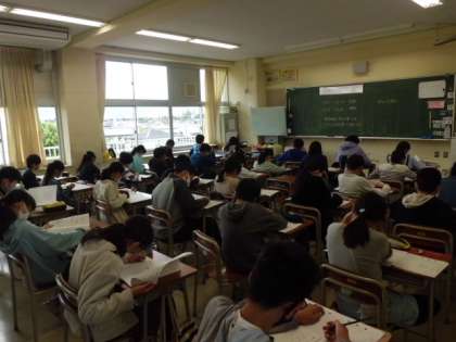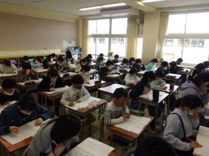 今日から前期学力調査が始まりました。初日の今日は、国語と理科に取り組みました。問題数は少ないですが、じっくり考える問題が多く「う〜ん」と頭をひねっているようでした。