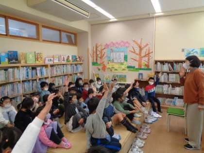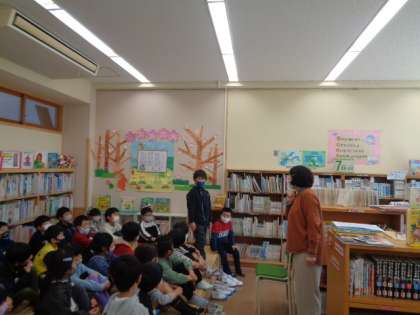 司書の先生から図書室の使い方についてお話を聞きました。本の扱い方や図書室の約束を聞きました。先生から、クイズを出された子供たちは、「図書室で遊ばない」「本は大切に使う」などしっかりと答えていました。最後は、読み聞かせもしていただき、「本が読みたいな」という気持ちになりました。子供たちは、自分が読みたい本をわくわくしながら探していました。明日は、読書の時間があります。今日、選んだ本を読むのがとても楽しみな子供たちでした。