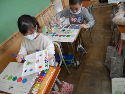 3年生になって最初の図工をしました。子供たちは朝から楽しみにしていました。今日は絵の具を混ぜたり、水の量を調整したりして、いろいろな色をつくりました。「白を混ぜたら薄くなるよ」「4色以上混ぜると暗くなるよ」などさまざまなことに気づきながら色をつくりました。自分のお気に入りの色を見つけたようでした。