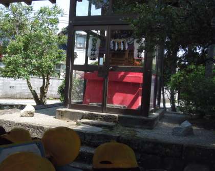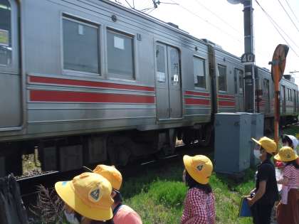 3、4組は、ピンク・紫コースに探検に行きました。朝菜神社や、上堀駅を見てきました。上堀駅へ向かう電車にも出会うことができました。