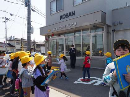 3、4組は、ピンク・紫コースに探検に行きました。下堀交番や朝菜町公園を見てきました。下堀交番では警察官の方が出てきてくださり、あいさつをしてきました。