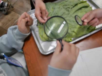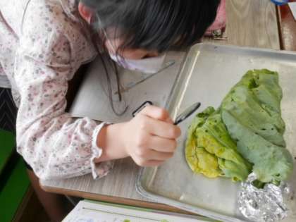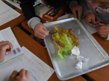 モンシロチョウのたまごの観察から約2週間が経ちました。たまごからかえった幼虫の観察をしました。幼虫によっては2センチメートルを超えるものもいて子供たちは興味津々に見ていました。「虫眼鏡で見ると毛が生えているのが見えるよ」「フンをちょうどしているところが見えた」と話しながら観察をしていました。虫眼鏡でピントを合わせることも上手になってきました。