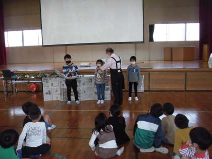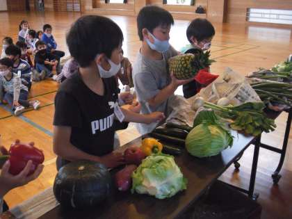 また、たくさんの野菜を持ってきていただき、それらを間近に見たり、触ったりさせてもらえ、「かぼちゃってこんなに重いのだね」「おいしそうだね」と子供たちは野菜に興味をもったようです。