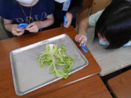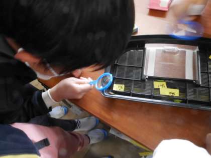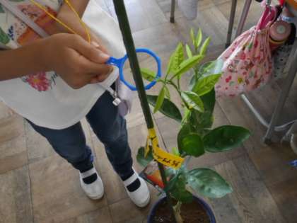 モンシロチョウの幼虫がさなぎになってきました。虫眼鏡のピントの合わせ方も上手になり、近くで観察していました。卵や幼虫の姿と比較しながらさなぎの特徴をに気づくことができました。今、アゲハチョウの幼虫も卵からかえってきました。「モンシロチョウと違って黒いし小さいね」と、生き物による違いに興味津々でした。
