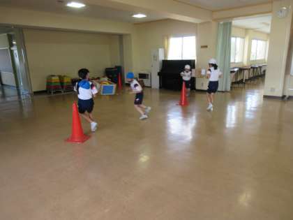 ボール運びは、二人一組で箱に入ったボールを運びます。息を合わせて、落とさないようにコーンを回り、次の友達に渡します。もっともっと上手になりたいと考えていました。