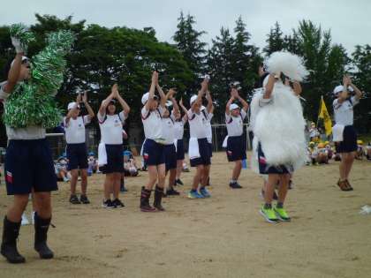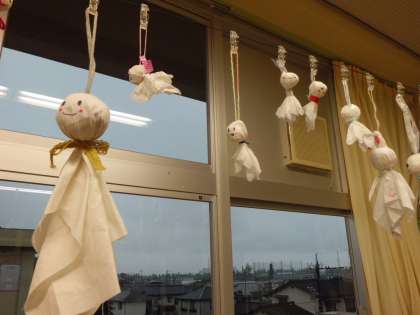 明日、晴れますようにと願いを込めて「てるてる坊主」を教室に飾っています。