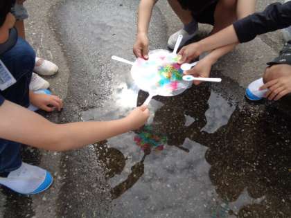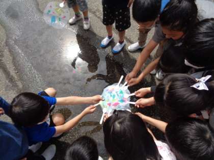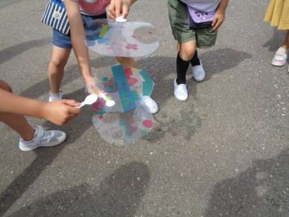 図画工作科の学習でつくった、うちわ(カラーセロハンが貼ってあります)を太陽の光に当ててみました。きれいな色が地面にうつって、興奮気味の子供たちでした。また、友達のうちわと重ねてみると、もっとカラフルに色が強く映り、「ひかりのプレゼント」に大喜びの子供たちでした。映された模様だけでなく、友達とよさを見つけ合ったり、友達と重ね合ったりする楽しさもプレゼントされたような気がします☆