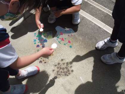 図画工作科の時間に光のプレゼントの学習を行いました。セロハンをすきな形に切り抜いて貼ったうちわを、太陽の光に当ててみました。子供たちは、光を通して地面に映る模様を見て「きらきらして、きれいだね」「友達のうちわと重ねると、色が混ざっていてすてきだね」とたくさんのすてきを見付けていました。