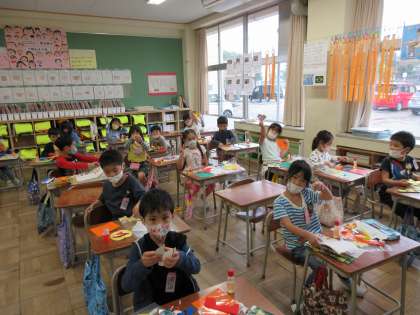 図工では、練習してきたはさみの使い方や飾りの作り方を思い出しながら、本番の作品づくりに挑戦しています。