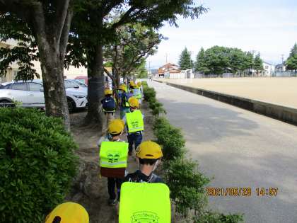 一列に並んで帰っています。交通ルールを守って楽しく、安全に帰りましょうね。