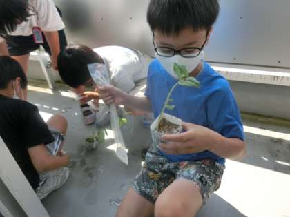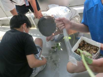 先月から育てはじめたインゲンマメもすくすく育ち、ずいぶんと大きくなりました。実験を通して、発芽に必要な条件も分かりました。今日は、肥料がどのように成長に関係するかを調べるため、肥料をやりました。この後の変化が楽しみです。
