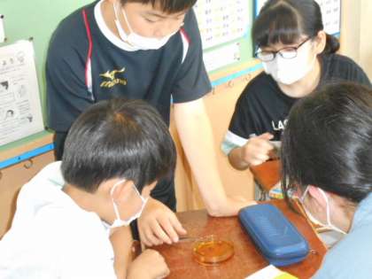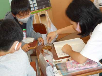 発芽する前と発芽してから時間がたった子葉に、でんぷんが含まれているか確かめました。ヨウ素液に浸し、色が変化する様子を見て、子葉に含まれる養分が発芽にとって大切だということを学ぶことができました。