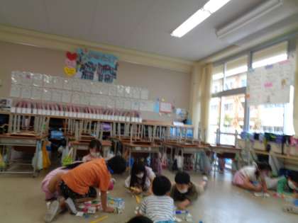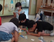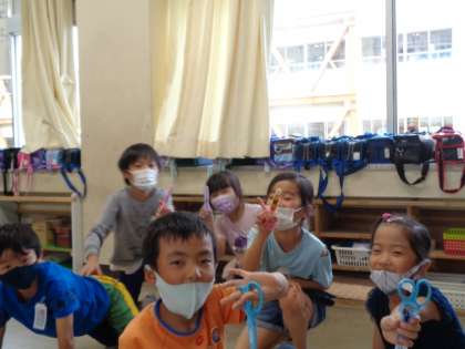 牛乳パックを使って「ぱっちんがえる」をつくりました。完成したけれど、なかなか思うように跳ばず、「あれ?」「どうして?」と考えこむ子供たちです。教え合って作っていましたが、友達と相談して、「ゴムは1回ねじりの方がいいかな?」「いや、もっとひねっていみる?」と試行錯誤を重ねて始めていました。これからのおもちゃづくりが楽しみです。