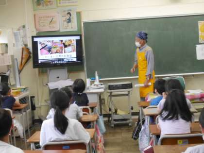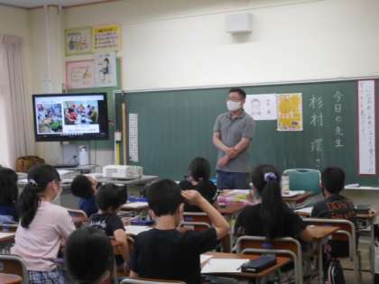 今日は蜷川地域で活動されている「にながわふれあい子ども食堂」から3名が来校され、子ども食堂について話をしてくださいました。子どもたちの中には毎月行っている子や手伝いとして関わっている子がおり、身近な存在である子ども食堂さんの話を真剣に聞いていました。子どもだけでなく幅広い世代が集まり交流する場であること、地域とはみんなで支え合い助け合う社会であることを知ることができました。