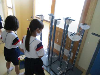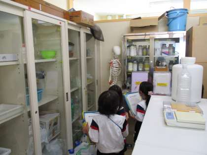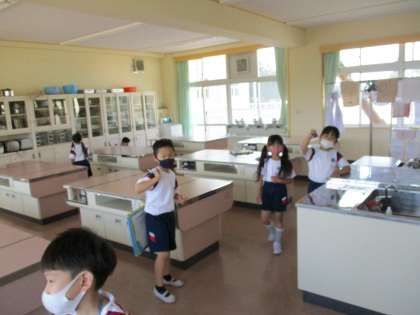まずは、理科室と家庭科室の様子を紹介します。理科室では、「がいこつがあるよ。怖いな」「これは何に使う道具なんだろう」「早く実験がしたいな」とたくさんの声が聞こえてきました。家庭科室では、「これは料理に使う道具だね」「洗濯機があるのはどうしてだろう」と知っている道具をたくさん見つけていました。