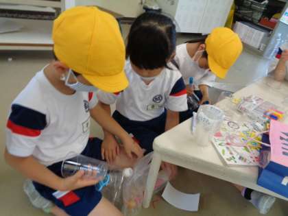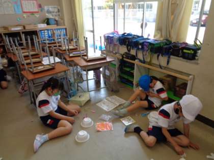 生活科の学習で、「うごくおもちゃ」をつくりました。ゴムの力、風の力を利用して動くおもちゃづくりを楽しみました。子供たちは、「もっとゴムをねじってみよう」「ゴムの数を増やしてみよう」「袋の中に、もっと空気をためて勢いよく押そう」など気付いたことがいっぱいのようです。工夫して、もっと楽しく遊びたいという気持ちが強くなりました。材料の準備、ありがとうございました。