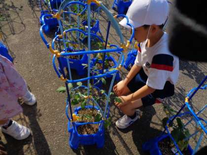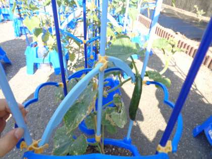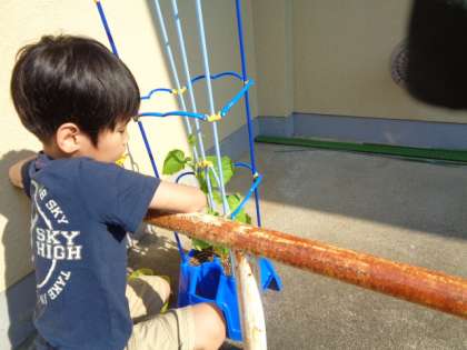 育てている野菜が大きくなってきました。子供たちは、毎日水をやったり、虫から守ったりしながら大切に育てています。キュウリは大きくなるのがとても早いのですが、昨日見たときよりも大きくなっていることに気付いて、びっくりしていました。「明日、とれるかな?」と嬉しそうに話していました。
