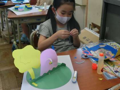 図画工作科では、円形の台紙が回ることで作品の見え方が変化する「くるくるランド」を作っています。実際に台紙を回したり見る角度を変えたりしながら、よりよい作品をめざして頑張っています。完成が楽しみです!