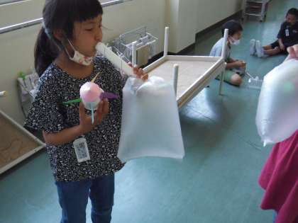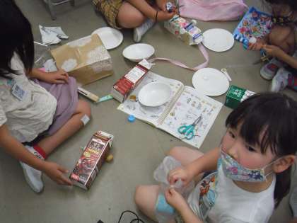 ビュンビュンカー、ふくろロケット、ストローアーチェリーなど、同じおもちゃを作っている子供たちでアドバイスし合い、楽しくおもちゃづくりを行いました。「たくさん動いてうれしい」「友達に聞いたら、もっと動くようになったよ」とできたおもちゃで遊んで楽しみました。また、「今日はあまり動かなかった」「次はもっと動くように工夫したい」と次回の活動に向けて考えている子供たちの様子も見られました。
