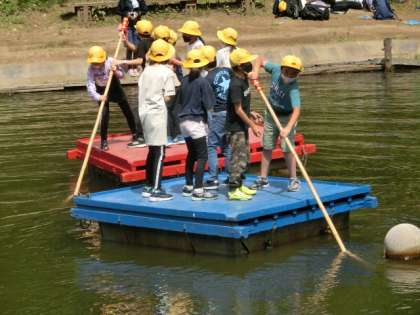 呉羽青少年自然の家 パート3(4学年) 公開日 2021/06/11 更新日 2021/06/11 4年生 いかだ遊びの様子です。友達と協力して、船をこぐ人を交代しながら行いました。思い通りの方向に行けず苦戦していましたが、楽しく取り組みました。