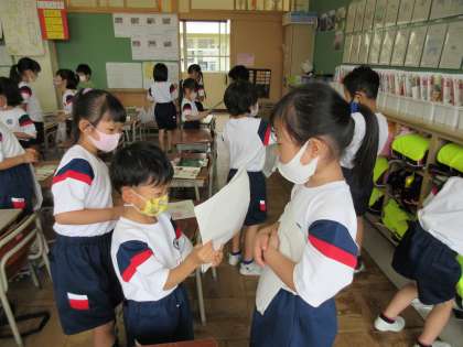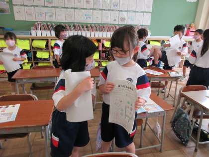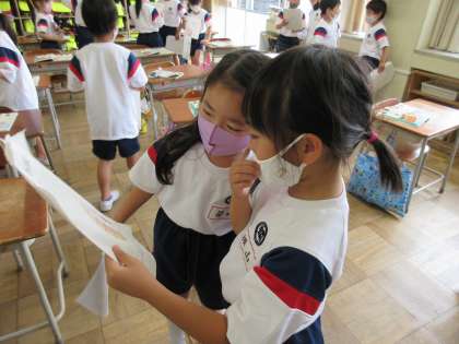 国語の時間に、学校探検で見つけた物や、見つけてどう思ったかを伝える活動を行いました。子供たちは、「理科室でがいこつを見つけました。とても怖かったです」や「コンピューター室にはたくさんのパソコンがありました。大きくなったらやってみたいです」など、とても上手に話していました。