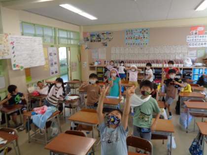 1・2組は、今年度初めてのプール学習に取り組みました。子供たちはプール学習をとても楽しみにしており、学習中もいきいきとした表情を見せていました。今日は、プールの使い方の説明を聞いたあと、小プールをみんなで歩いて水の流れをつくったり、水をかけあったりしながら、簡単な水慣れを行いました。プールに入ったあとも、とてもにこにこした、いい表情をみせてくれました。