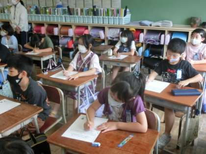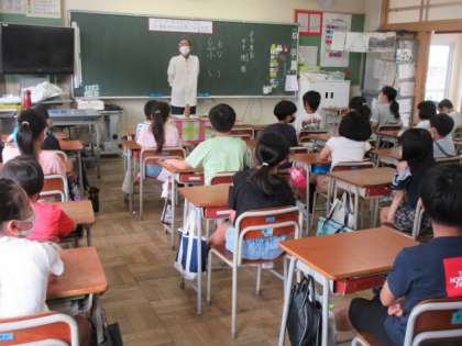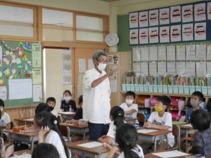 今回は地域で農家をされている方をゲストティーチャーにお迎えして、蜷川地域と農業についてお話を聞きました。子どもたちは登下校で田んぼや畑を目にすることも多いけれど農家をされている人については全く知らない状況でした。育てている野菜を直売所でお客さんと話をしながら販売していること、近くのスーパー、子ども食堂にも野菜を渡していること等地域とのつながりがあることを教えていただきました。また、1年中様々な野菜を作っておられることや農家を続けておられる理由など農家さんの思いも聞くことができました。