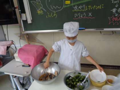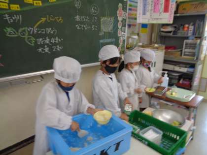 給食当番の仕方もずいぶん成長しました。自分たちで、準備や後片付けに取り組んでいます。盛りつけも丁寧にできるようにり、給食の準備にかかる時間が短くなってきました。日々、成長を感じるこの頃です。キュウリをよ〜く見てみると・・・かわいい顔が見えました☆子供たちとほっこりした時間になりました。