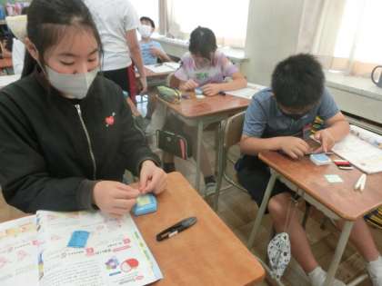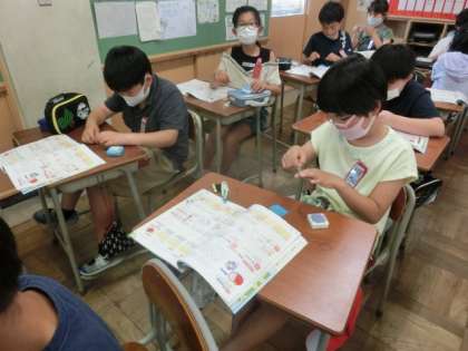 家庭科では、裁縫が始まりました。糸通し、玉結び、玉留めに挑戦です。なかなか苦戦している様子です。