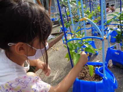大切に育ててきた野菜が実り、収穫をしている子供たちが増えてきました。水やりを増やしたり、肥料をまいたりしながら野菜とじっくり向き合い学習を進めています。そんな、大切な野菜が・・・今日、何者かにかじられていました!!!「カラスかな?」「つめのあとがあるから、猫かも」と心配そうに話していました。どう、野菜を守っていくか、次の学習が楽しみです。
