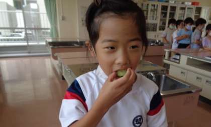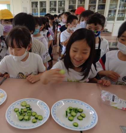 学年の畑で育てたキュウリがついに実りました。今日、育てたキュウリを味わいたい子供たちで家庭科室に集まり、実食しました。皆で愛情を注いで育ててきた野菜だからこそ、味わう子供たちの表情もとてもいきいきとしていました。
