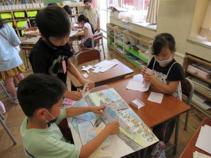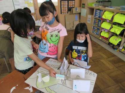 今日は、町に色を塗り、グループの友達と作品を並べて町づくりを楽しみました。