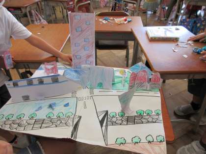 図工の時間に、紙を折って立つような作品をつくりました。町にどんな建物や乗り物などがあったらよいかを考え、形に表しました。