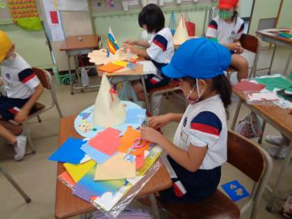 図画工作科の学習で、「すてきなぼうし」をつくっています。今日は、帽子に折り紙で飾り付けをしました。帽子をかぶると、自分の想像した世界が広がると考えて、工夫を凝らしながらつくっています。食べたい朝ご飯や、行ってみたい海の世界など一人一人のアイディアが光る帽子になりそうです。