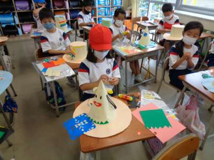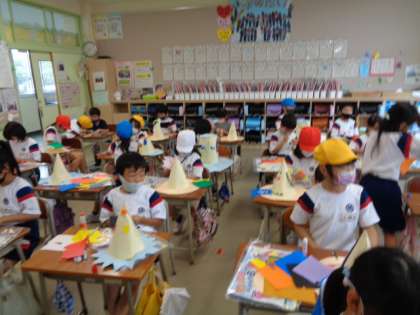 図画工作科の学習で、「すてきなぼうし」をつくっています。今日は、帽子に折り紙で飾り付けをしました。帽子をかぶると、自分の想像した世界が広がると考えて、工夫を凝らしながらつくっています。食べたい朝ご飯や、行ってみたい海の世界など一人一人のアイディアが光る帽子になりそうです。