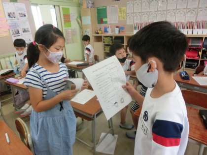 学活では、仲間との温かな言葉遣いを心掛けるため、困っている友達にどのような言葉がけを行うかを考え、ペアでロールプレイングを行いました。子供たちは、実際に仲間とやりとりをする中で、ぽかぽか言葉を使うことで言った人も言われた人も気持ちがよいということを実感していました。今回の学習をきっかけに、少しでも学級の中に温かな言葉が増えてほしいと思います。