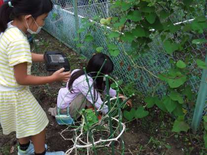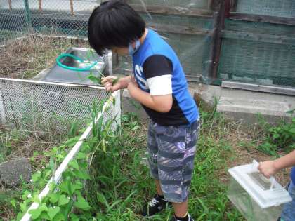 生活科の学習で、虫さがしに行きました。今日は、虫かごなどの入れ物を持ってきて、見付けた虫を大事そうに入れていました。「虫がいた場所にあった草や土を入れたらいいのではないかな」「安心して住めるおうちにしよう」と住処をつくったり、えさを調べたりしていました。これからも、大切にお世話をしてほしいです。