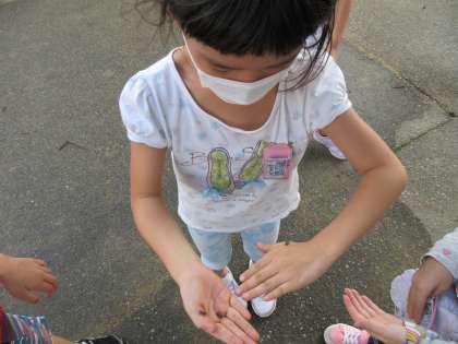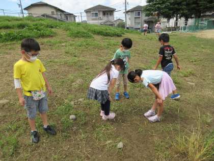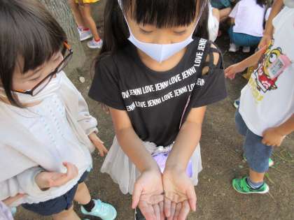 今までグラウンドで見たことのある虫を話合ったあと、本当にその虫がいるのかや、違う種類の虫がいるかを探しに行きました。「こんなにだんご虫がいる」「この虫はなんだろう、初めて見た」など、様々な発見がありました。