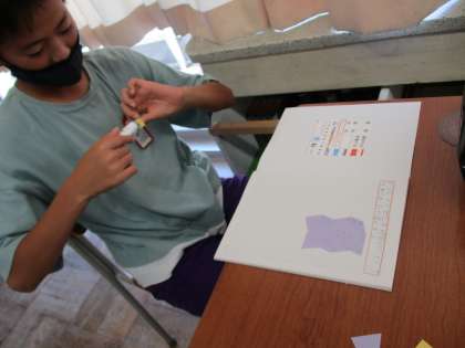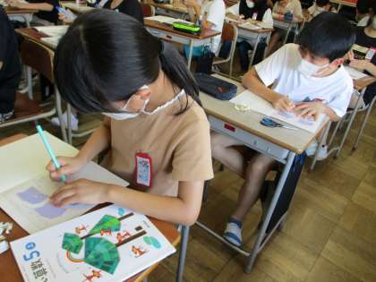 算数科では、多角形の内角の和について学習しました。既習事項をもとに、台形のしきつめに挑戦しました。みんな、上手に隙間なくしきつめています。